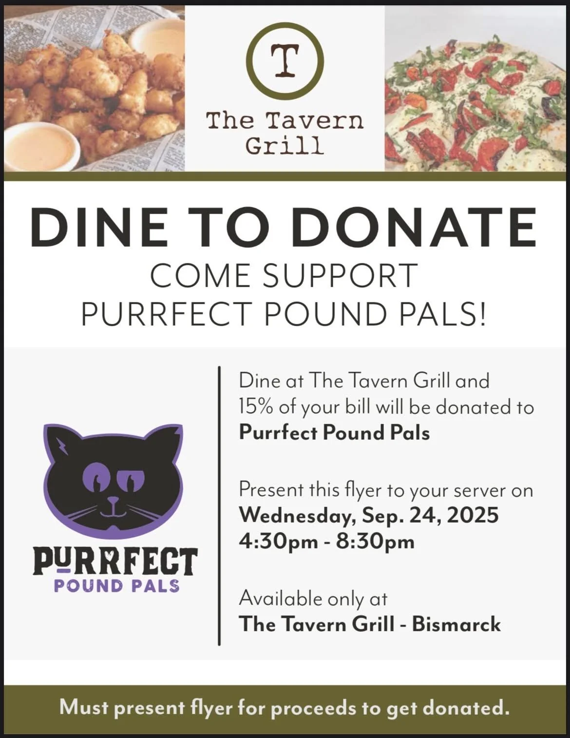Dine at The Tavern Grill and 15% of your bill will be donated to Purrfect Pound Pals! Present this flyer to your server on Wednesday, September 24, 2025 between 4:30pm and 8:30pm! DINE IN ONLY! You must present a physical copy of the flyer for the discount to apply! Print a copy of it HERE! A group from PPP will be there around 5:15pm if you want to join us!